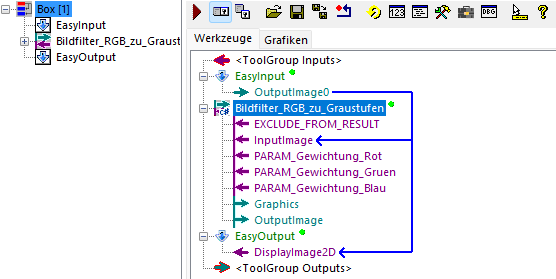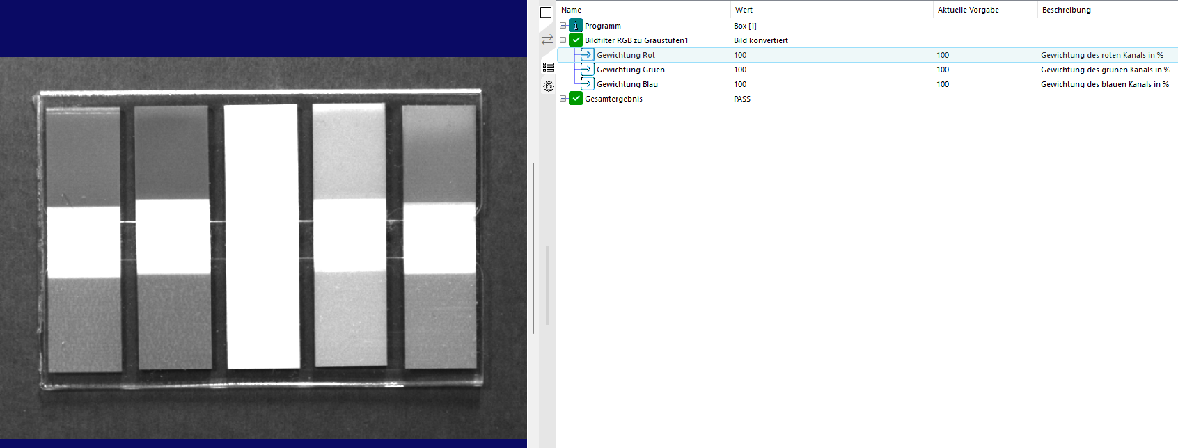 Dieses EasyTool konvertiert ein RGB Farbbild in ein Graustufenbild. Die Gewichtung der einzelnen Kanäle R (Rot), G (Grün) und B (Blau) kann separat eingestellt werden, dadurch ist es möglich einzelne Farbkanäle zu verstärken und abzuschwächen.