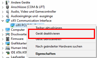 • cifX Karte im Geräte Manager deaktivieren und wieder aktivieren, um die Karte neu zu starten