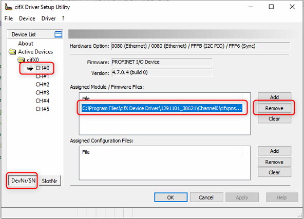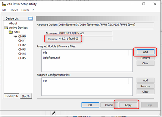 Neue Firmware cifxpns.nxf aus Update Paket mit Add laden und mit Apply laden