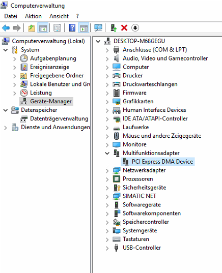 Bevor der Scanner parametriert wird, sollte die korrekte Verbindung mit der Frame-Grabber-Karte im PC sichergestellt werden. Dazu wird über die Systemsteuerung der Gerätemanager aufgerufen und die Multifunktionsadapter geöffnet. Hier sollte nun ein PCI Express DMA Device sichtbar sein. Falls nicht, bitte das Gerät nachmals nach Cognex-Manual anschließen.