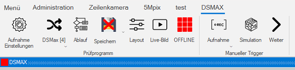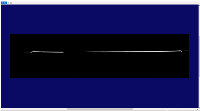 Zuerst sollte das Prüfobjekt in der 2D-Einrichtung in den Messbereich des Sensors gebracht werden. Es erscheint dort als Linie (siehe Bild unten). Dies erfolgt im Reiter Bildaufnahme. Danach wird die 2D-Einrichtung ausgewählt und der Sensor kontinuierlich getriggert, während das Objekt ins Bild geholt wird. Man beachte dabei den Arbeitsabstand des DSMAX von 55mm +/- 5mm.