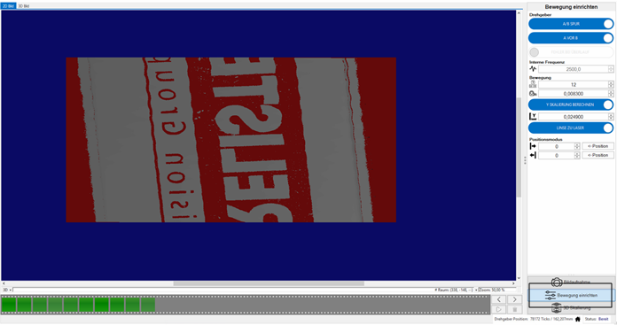 Nun kommen wir zu den Einstellungen für die Taktung des Encoders. Die interne Frequenz des Drehgebers wird automatisch bezogen. Falls nicht kann sie hier manuell eingetragen werden. Unter der Bezeichnung Bewegung findet sich zuerst die Angabe der Ticks pro vollständigem Encoder-Zyklus und die Schrittweite eines Ticks in mm. Diese Angaben sind dem Encoder zu entnehmen. Falls diese Werte nicht bekannt sind, aber die y-Skalierung, kann dies per Schieberegler umgeschaltet werden. Im Feld darunter wird die errechnete Skalierung ausgegeben oder die manuelle eingegeben.