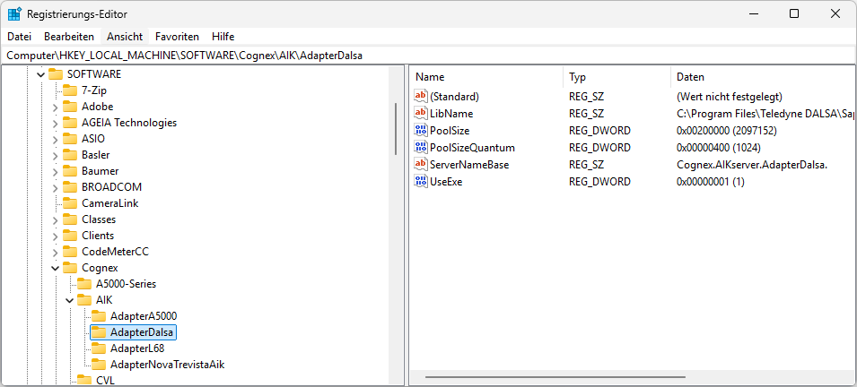 Schlüssel: HKEY_LOCAL_MACHINE\SOFTWARE\Cognex\AIK\AdapterDalsa