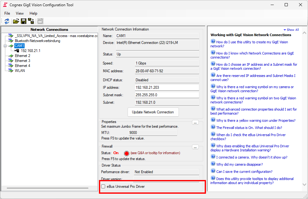 Vor Parametrierung der Kamera muss die Readme.txt des Adapter gelesen werden, da es vor allem im Speichermanagement ein paar Einschränkungen gibt.