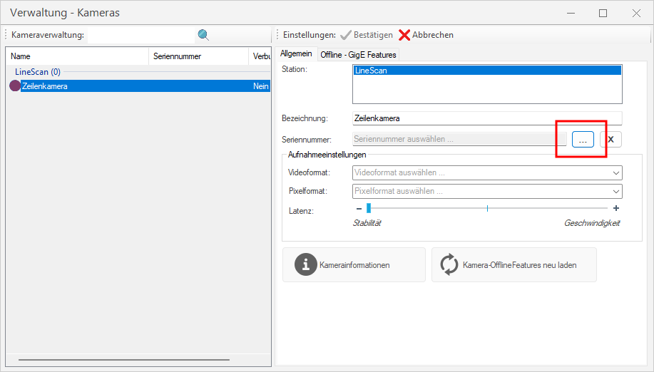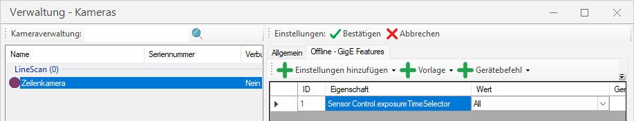 Damit die Belichtungszeit in EasySightPro wie gewohnt für alle Kanäle gesetzt werden kann, wird empfohlen den Sensor "Control.exposureTimeSelector" in den Offline - GigE Features der Kameraverwaltung auf "All" zu setzen, damit die Belichtungszeit für die RGB Zeilen synchron gesetzt werden kann.