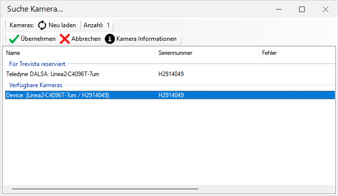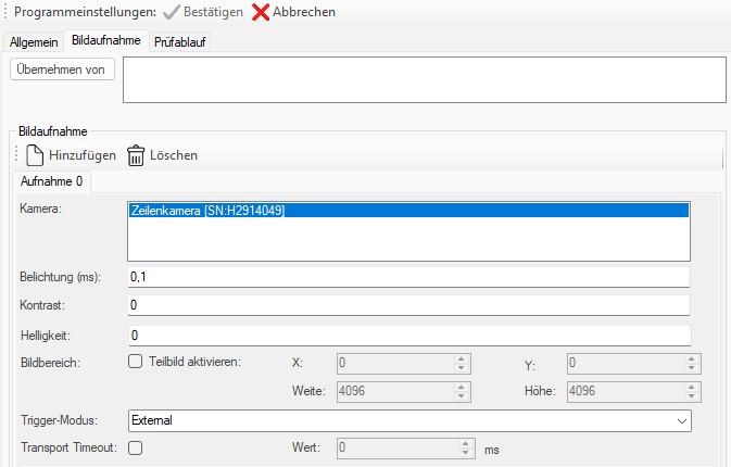 Die Grundkonfiguration wie digitale Ein-/Ausgänge und Bildhöhe sollte soweit möglich mit der Teledyne Sapera CamExpert durchgeführt und direkt in der Kamera als UserSet gespeichert werden.