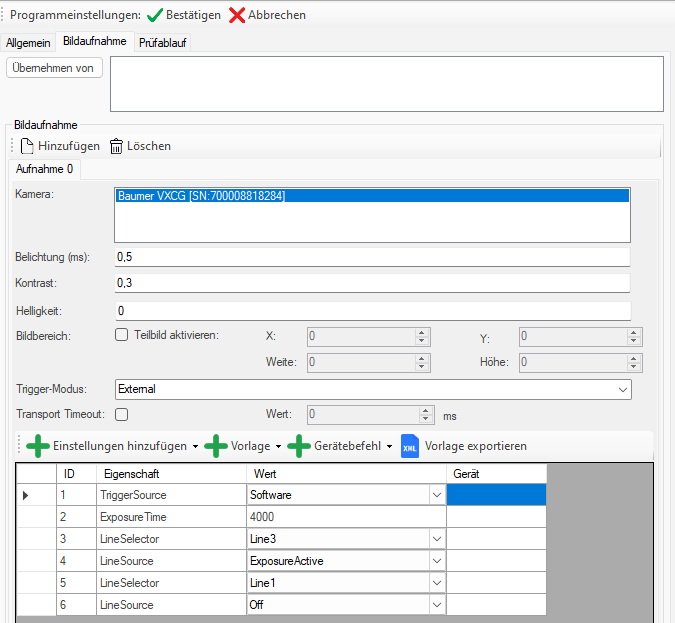 Wenn die Belichtungszeit von Bild zu Bild geändert werden soll, dann muss das Feature ExposureTime oder ExposureTimeAbs eingefügt werden. Die Benennung variiert je nach Kamerahersteller.