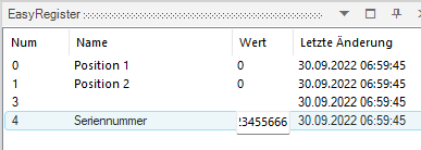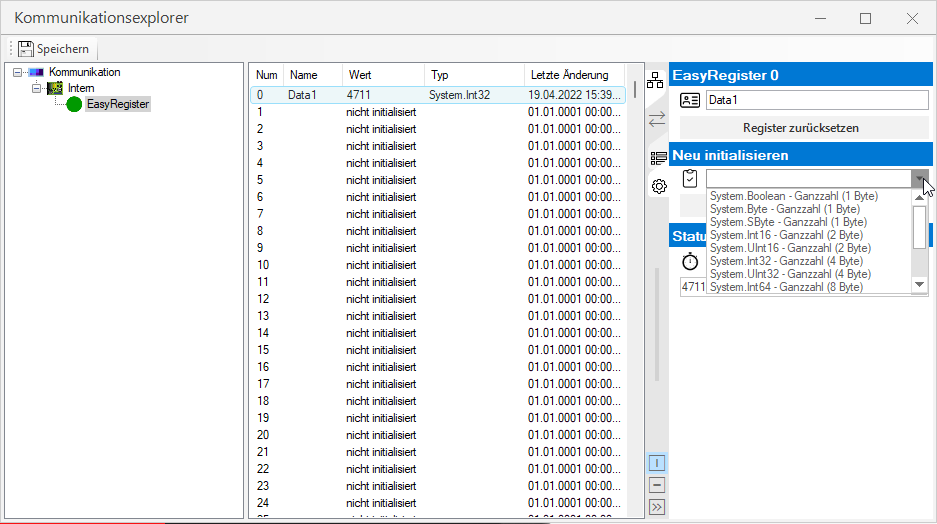 Sobald man im Kommunikationsexplorer links das EasyRegister ausgewählt hat, kann man in der Liste in der Mitte den jeweiligen Registereintrag anwählen. Im Eigenschaftsfenster rechts kann man nun zuerst dem ausgewähltem Registereintrag einen Namen vergeben. Im Feld Neu Initialisieren wählt man anschließend aus der DropDown Liste den gewünschten Datentyp, mit welchem dann der Registereintrag über den Button Datentyp initialisieren initialisiert wird. Im Feld Status sieht man den Zeitpunkt der letzten Änderung des Registereintrags sowie den aktuellen Wert. Man kann diesen Wert auch hier direkt verändern.