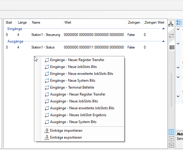 Im mittleren Teil des Kommunikationsexplorer kann man nun durch Rechtsklick einzelne Feldbus Bausteine hinzufügen, oder bereits vorhandene bearbeiten oder löschen.