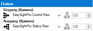 Die Variable für die Kamera Eingangs- und Ausgangsdaten kann in der Auswahlliste ausgewählt oder manuell eingegeben werden. Die Auswahlliste ist nur verfügbar, wenn die Kommunikation mit der SPS funktioniert.