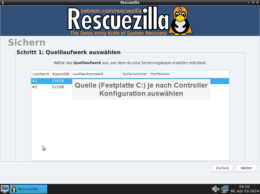 Schritt 1: Quelllaufwerk auswählen. Hier muss das System-Laufwerk des Controllers ausgewählt werden.