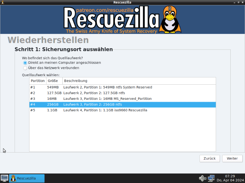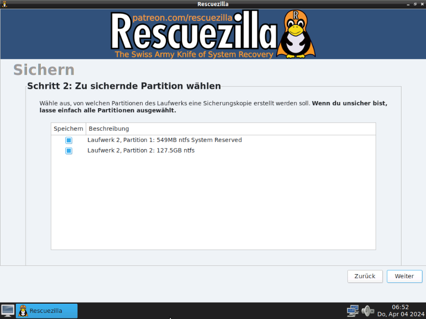 Schritt 2: Zu sichernde Partition wählen. Hier alle verfügbaren Partitionen markieren (Standard Einstellung).