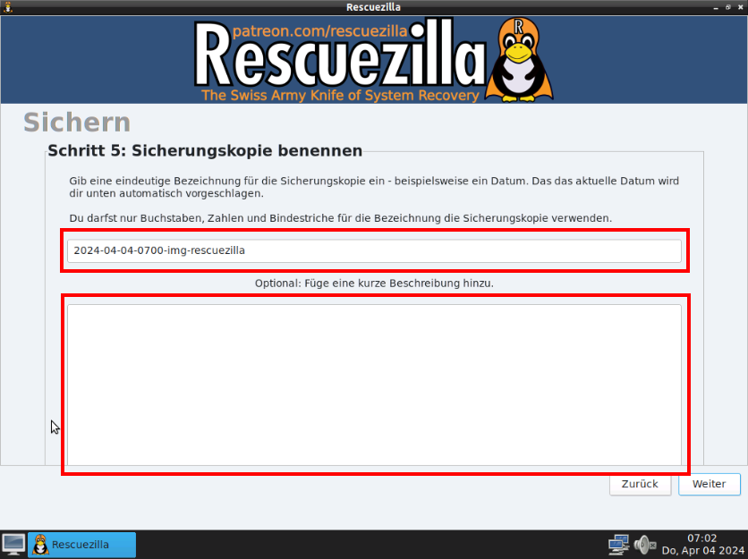 Schritt 5: Sicherungskopie benennen. Empfehlung: [ZEITSTEMPEL]-[BESCHREIBUNG]