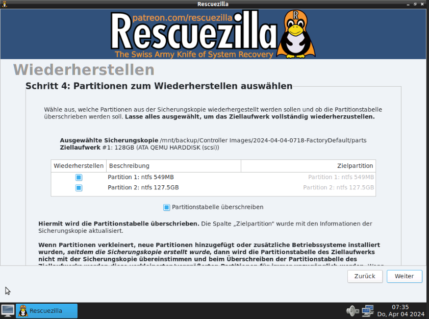 Alle Controller werden vor Auslieferung mit Hilfe von Rescuezilla gesichert. Die Sicherungen sind unter 'D:\Controller Images' zu finden.