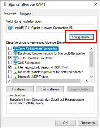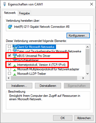 Wichtig: Für die Kameraverbindung ist nur "eBUS Universal Pro Driver" und "Internet Protocol Version 4" notwendig.