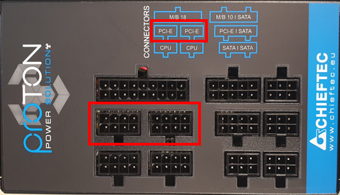 Die Grafikkarte MUSS zwingend mit dem richtigen Kabel (Beschriftung PCI-E) an das Netzteil (Port PCI-E) angeschlossen werden. Eine falsche Verkabelung kann zur Beschädigung des Netzteil oder der Grafikkarte führen.