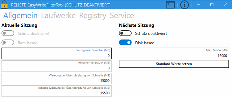 Das erste Bild zeigt die allgemeine Ansicht beim Aufrufen des EasyWriteFilterTools. Hier ist der aktuelle Status des Schreibfilters unter „Aktuelle Sitzung“ ersichtlich. Falls der Schreibschutz aktiviert ist erscheint unten der Hinweis unten in roter Schrift: Schreibschutz ist aktuell aktiv. Auf der rechten Seite kann der Schutz für die nächste Sitzung aktiviert oder deaktiviert werden. Zusätzlich kann die Art des Schutzes „Disk Based“ oder „Ram Based“ ausgewählt werden und die maximale Größe des Zwischenspeichers festgelegt werden.
