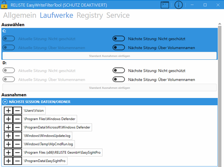 Im Reiter Laufwerke kann der Status der im System vorhandenen Partitionen eingesehen und für die nächste Sitzung verändert werden. Reliste empfiehlt einen Schutz der Laufwerke über den Laufwerksbuchstaben, um beim Ersetzen von Komponenten Komplikationen zu vermeiden. Außerdem können hier Dateipfade ausgenommen werden, um diesen das Schreiben auf die Festplatte zu erlauben. Hierbei sind unbedingt die Hinweise zu beachten. Wenn der Schutz aktiviert ist können die Standard Ausnahmen eingefügt werden. Dies erlaubt Easy Sight Pro und Windows-Funktionen weiter auf die Festplatte zu schreiben.