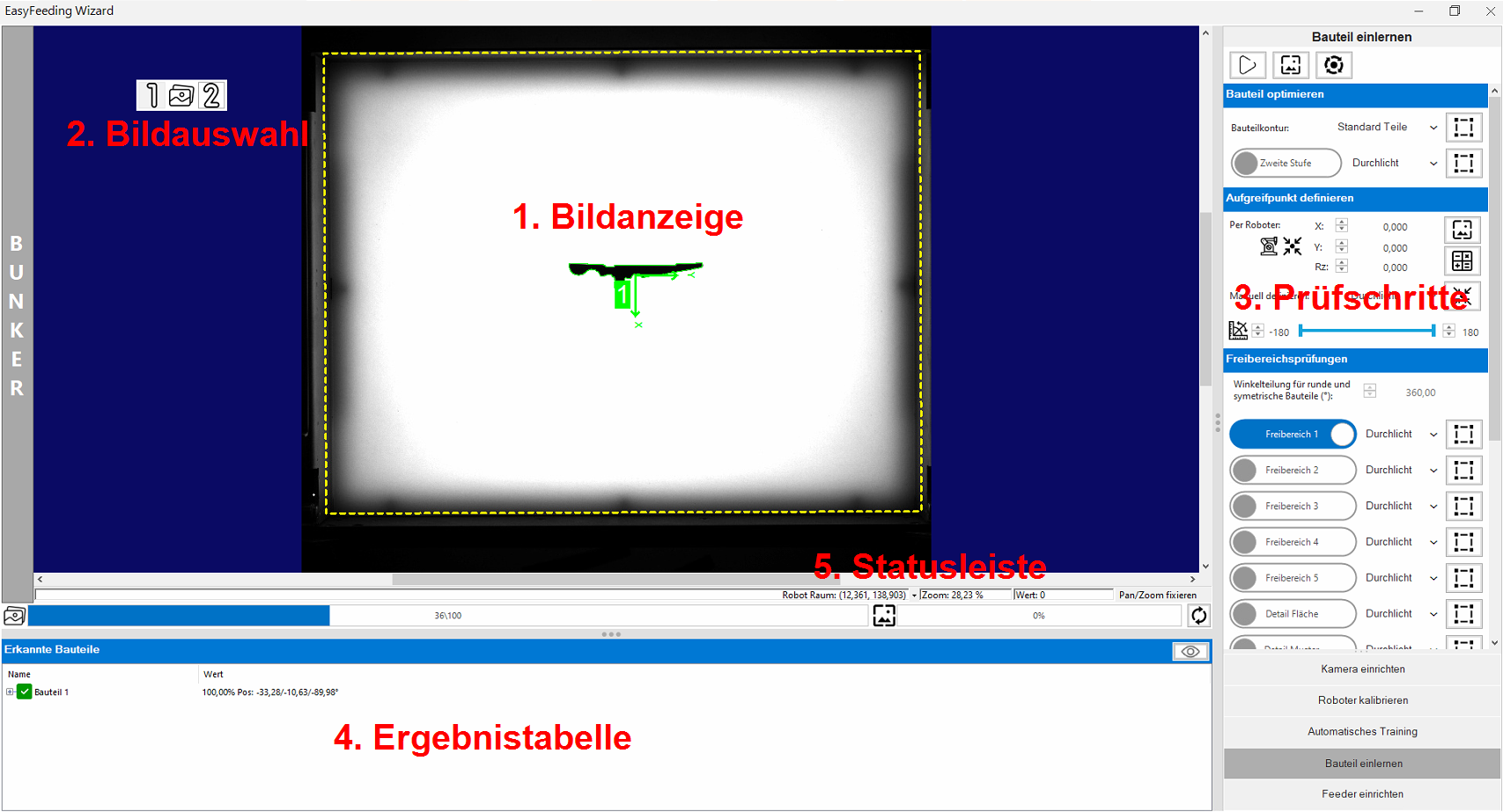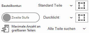 it is possible to limit the number of parts to be gripped per detection run. This leads to an increase in the cycle time if there are a large number of parts on the feeder and a new image is forced with each run. The detection routine stops when the desired number of parts to be gripped is reached.