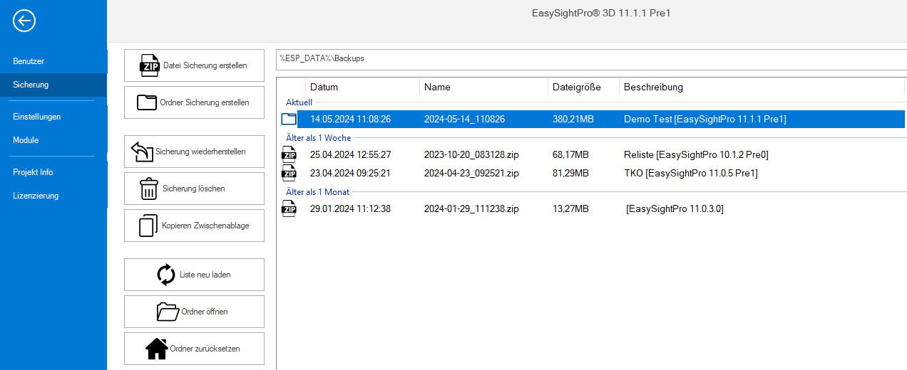 Information: A backup contains all relevant data such as program settings, test sequence. To ensure that external data (e.g. DeepLearning Runtime, saved calibrations) are automatically saved, they must be stored in %PROGRAMDATA%\EasySightPro\Binaries..
