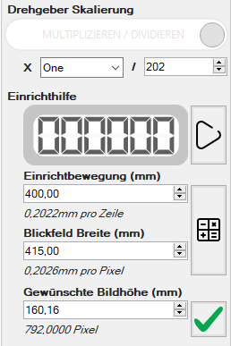 | Rotary encoder scaling | Conversion factors of the pulses to the corresponding camera lines. |