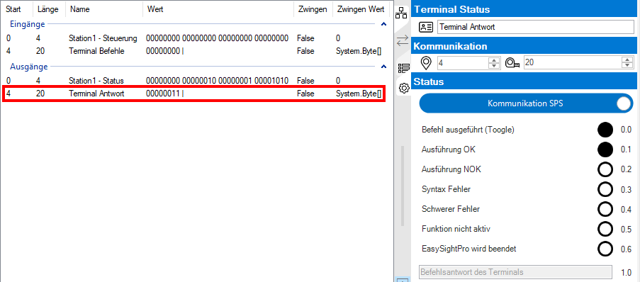 Mit dem Einfügen des Bausteins wird zugleich auch bei den Ausgängen ein Baustein mit dem Terminal Status eingefügt.