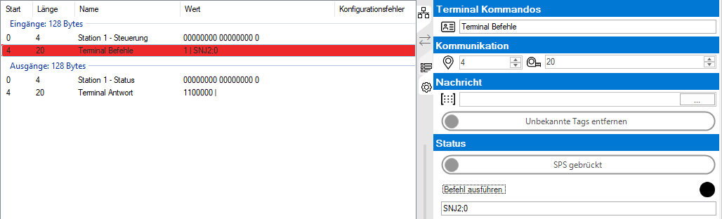 | Terminal Command | 1 - X | Here the command is transferred as a string. The available commands can be found under Terminal commands. |