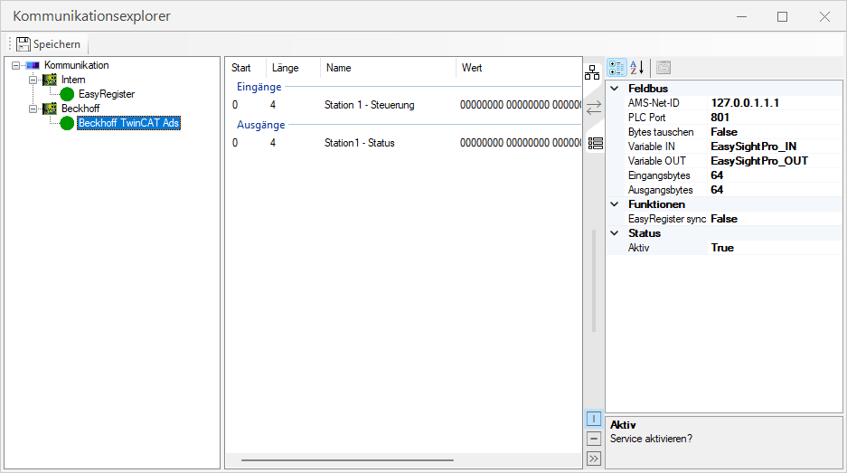 The status of the communication between EasySightPro® and the external control via TwinCAT Ads is displayed. Here you can see if there is a connection to the external control.
